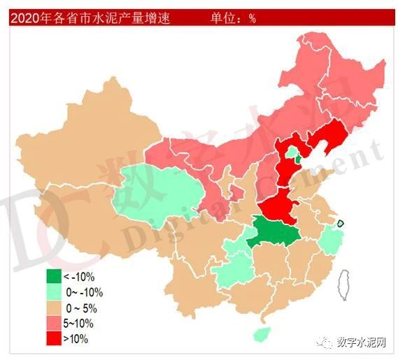 分区域看,2020年全国六大区域市场中,北方区域累计水泥产量同比增速持续提升且快于南部区域。其中,华北和东北保持高位增长,除京津地区外各省份同比均有明显增长,河北和辽宁增速达到两位数以上;西北地区总体呈现同比小幅增长,除青海需求大幅下降外,其他省份同比均实现不同幅度增长。南方区域中,华东和中南水泥产量年末实现由负转正,但长三角地区较去年同期仍有小幅下降;西南地区累计水泥产量同比仍略有下降,降幅持续收窄至不足1%。