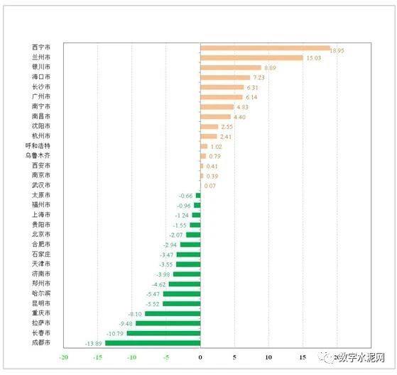 从全年均价价格同比涨幅来看,涨幅最大的分别是西宁、兰州、银川,同比上涨涨幅分别达到了19%、15%和9%,降幅最大的分别是成都、长春、拉萨和重庆,分别同比下降13%、11%、9%和8%。