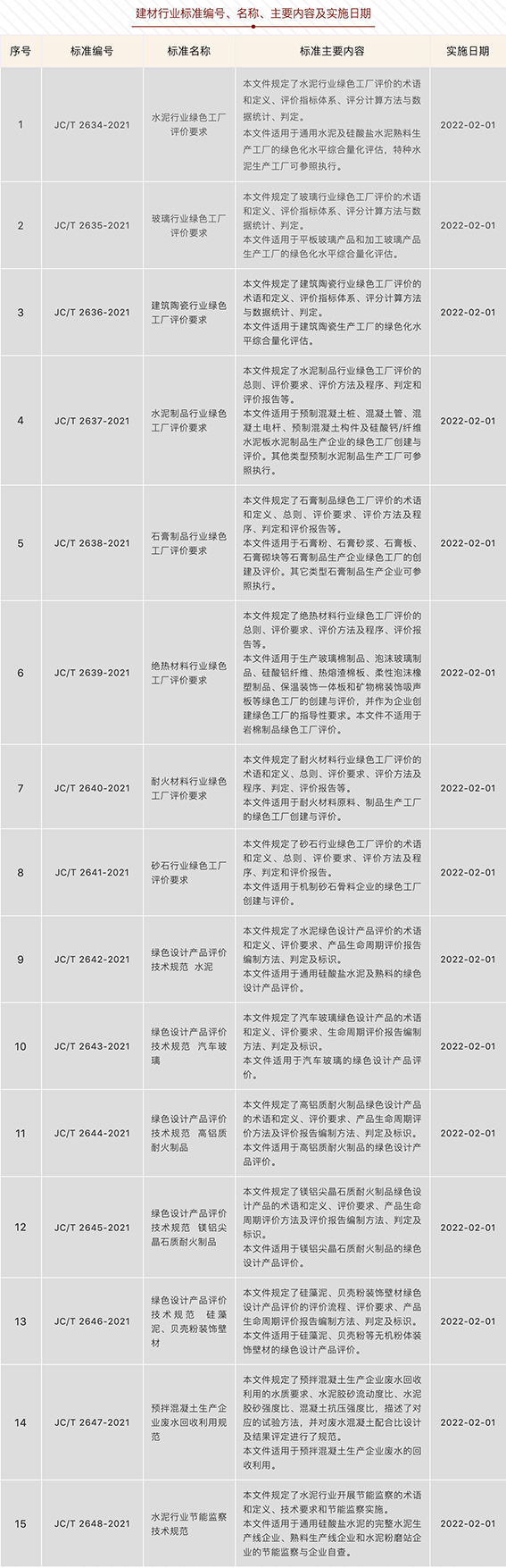 近日,工业和信息化部批准《石油和化工行业绿色工厂评价导则》等250项行业标准,其中包括建材行业标准15项,涉及水泥、玻璃、建筑陶瓷、水泥制品、石膏制品、绝热材料、耐火材料、砂石等8个行业的绿色工厂评价要求,水泥、汽车玻璃、高铝质耐火制品、镁铝尖晶石质耐火制品和硅藻泥、贝壳粉装饰壁材等5类产品的绿色设计标准。绿色工厂系列标准为规范相关行业绿色工厂建设与评价提供了的依据,绿色设计产品系列标准从资源、能源、环境、产品品质四个维度为开展产品绿色设计评价与认证提供了相关依据。相关标准将于2022年2月1日实施,由中国建材工业出版社(已更名为“中国建设科技出版社”)出版。