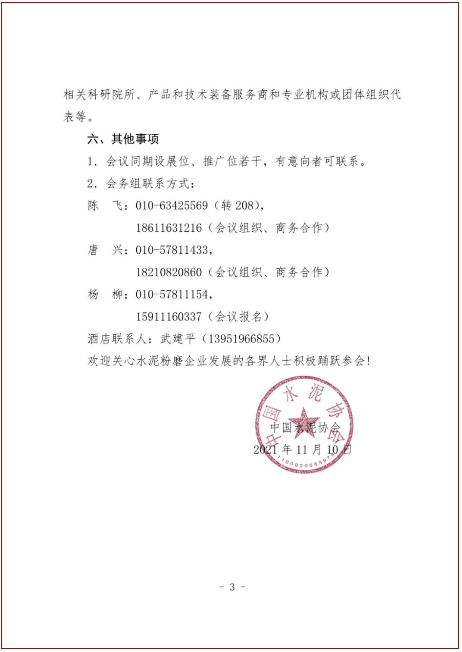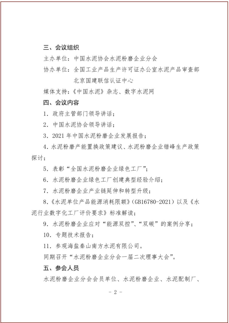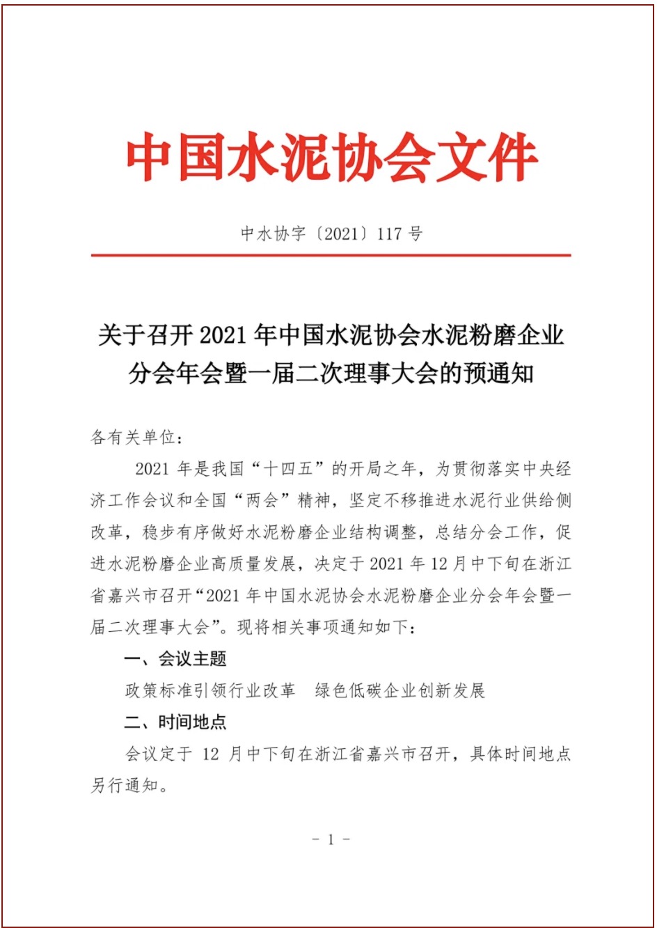 关于召开 2021 年中国水泥协会水泥粉磨企业 分会年会暨一届二次理事大会的预通知