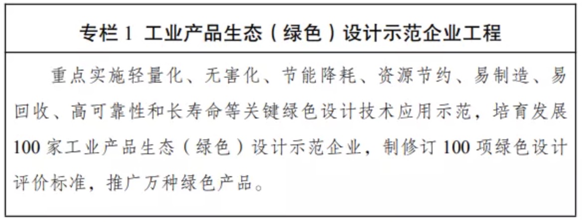 (四)推行工业产品绿色设计。健全工业产品绿色设计推行机制。引导企业改进和优化产品和包装物的设计方案,减少产品和包装物在整个生命周期对环境的影响。在生态环境影响大、产品涉及面广、行业关联度高的行业,创建工业产品生态(绿色)设计示范企业,探索行业绿色设计路径。健全绿色设计评价标准体系。鼓励行业协会发布产品绿色设计指南,推广绿色设计案例。