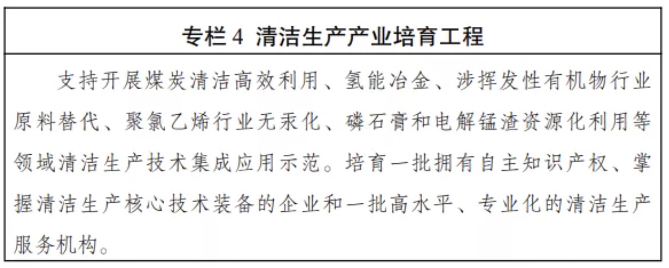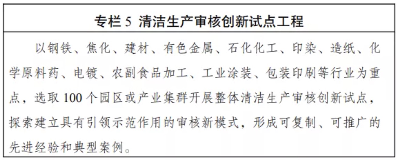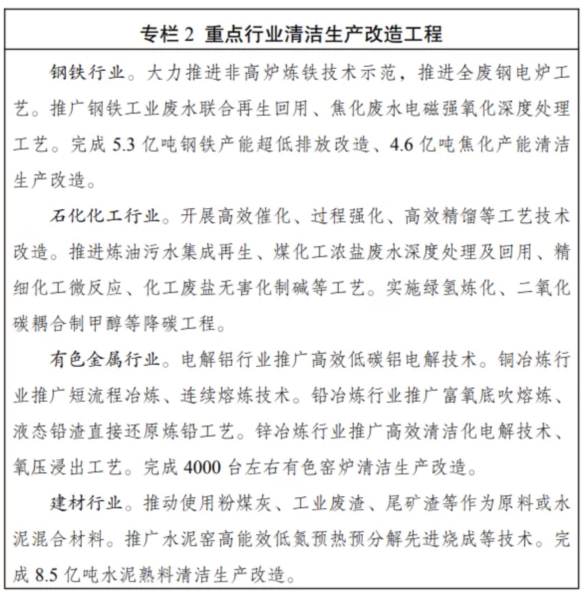 (六)大力推进重点行业清洁低碳改造。严格执行质量、环保、能耗、安全等法律法规标准,加快淘汰落后产能。全面开展清洁生产审核和评价认证,推动能源、钢铁、焦化、建材、有色金属、石化化工、印染、造纸、化学原料药、电镀、农副食品加工、工业涂装、包装印刷等重点行业“一行一策”绿色转型升级,加快存量企业及园区实施节能、节水、节材、减污、降碳等系统性清洁生产改造。在国家统一规划的前提下,支持有条件的重点行业二氧化碳排放率先达峰。在钢铁、焦化、建材、有色金属、石化化工等行业选择100家企业实施清洁生产改造工程建设,推动一批重点企业达到国际清洁生产领先水平。