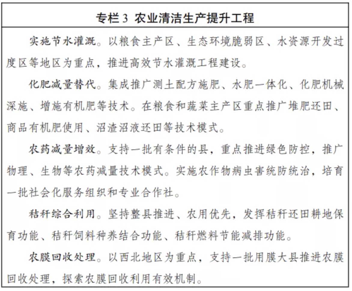(八)提升农业生产过程清洁化水平。改进农业生产技术,形成高效、清洁的农业生产模式。严格灌溉取水计划管理,大力发展旱作农业,全面推广节水技术,不断提高农业用水效率。深化测土配方施肥,推广水稻侧深施肥等高效施肥方式。全面推广健康养殖技术,推动兽用抗菌药使用减量。加快构建种植业、畜禽养殖业、水产养殖业清洁生产技术体系,大力推广种养加一体化发展模式。